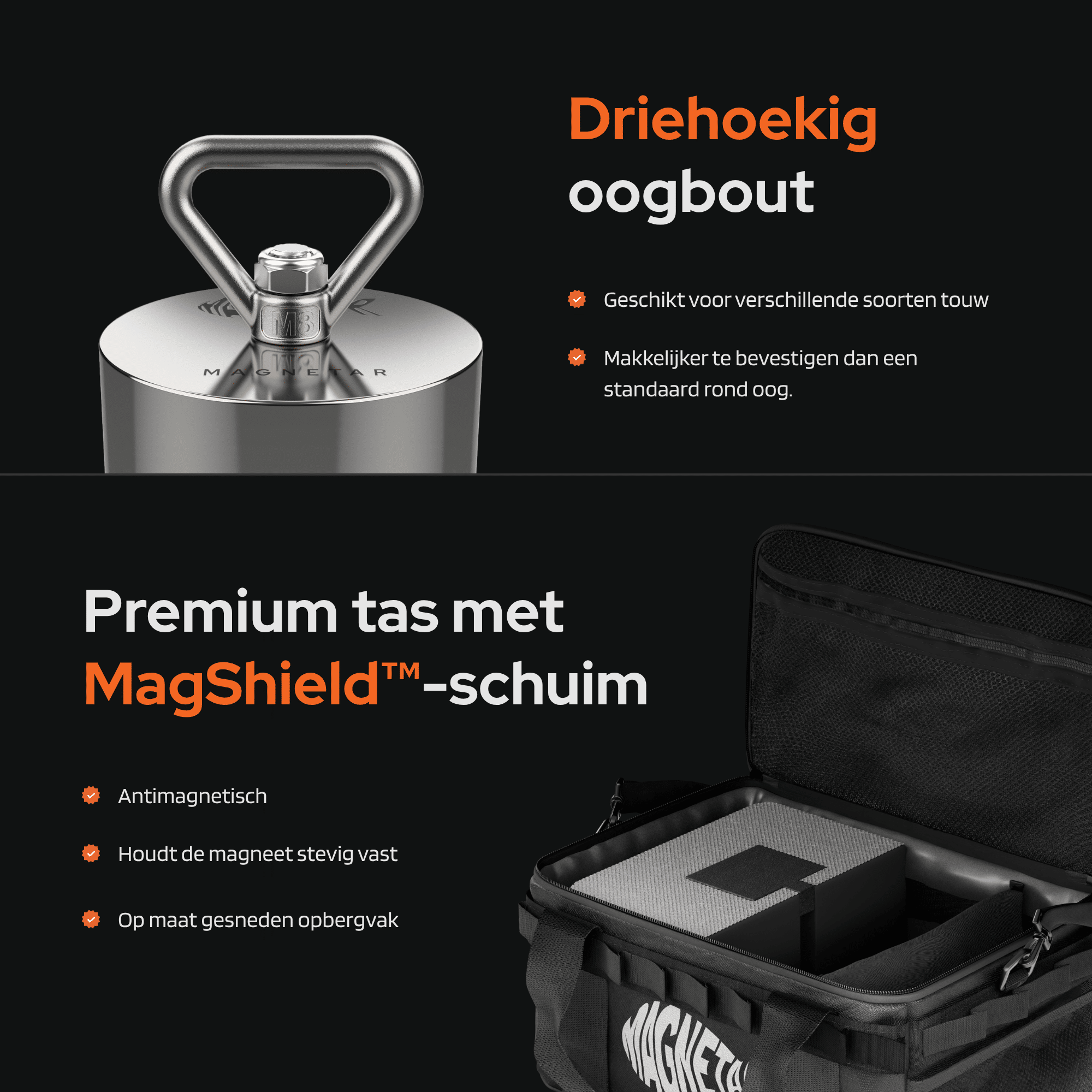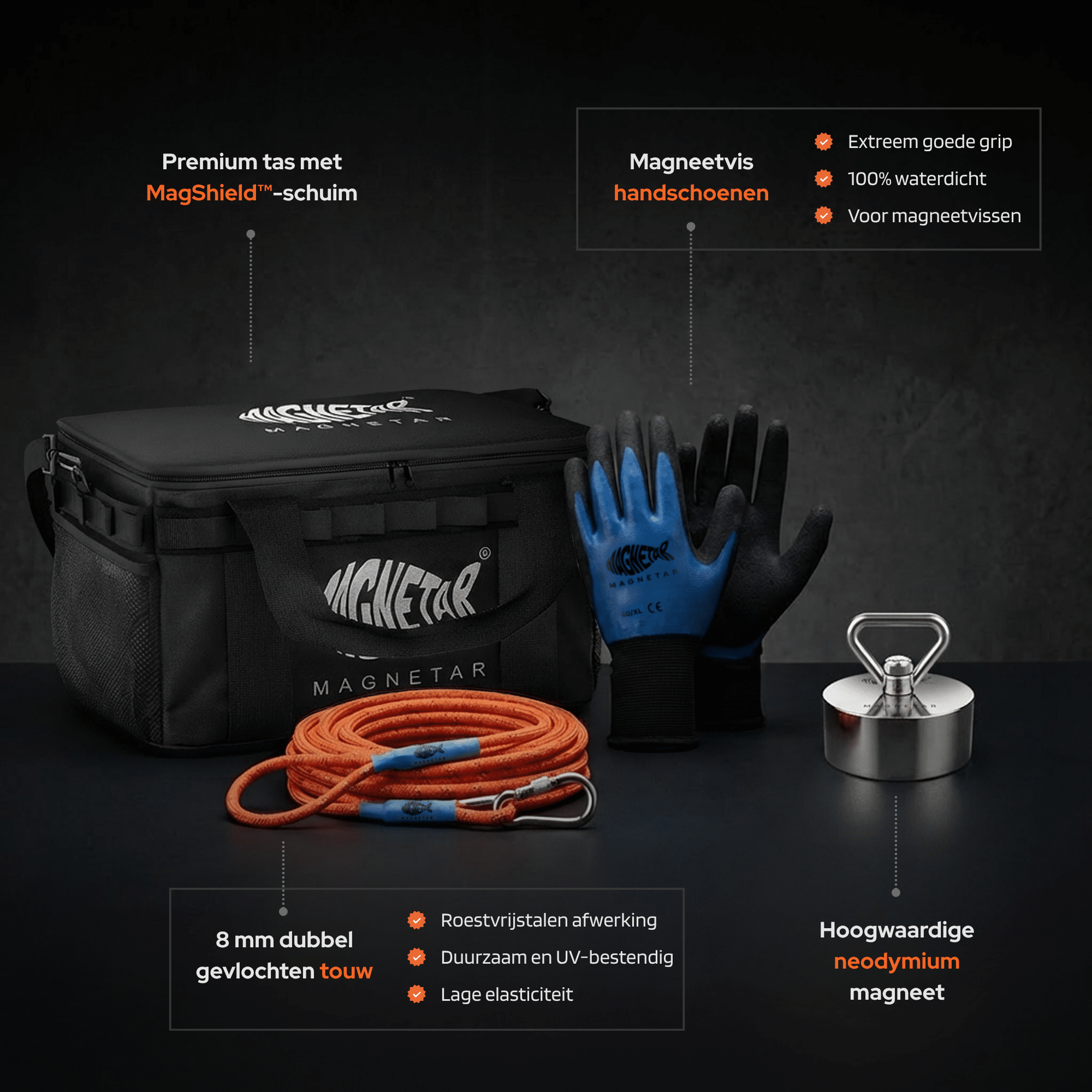 Bij ons familiebedrijf Magnetar® denken wij met jou mee. Wij weten wat belangrijk is bij magneetvissen door onze jarenlange ervaring. Deze kennis hebben wij samengevoegd in deze vismagneetset. Een krachtige allround vismagneet, volledig gebruiksklaar en geleverd in een praktische tas. Deze MagShield tas beperkt magnetische kracht tijdens vervoer en opslag, zodat jij zonder zorgen op avontuur kan gaan.